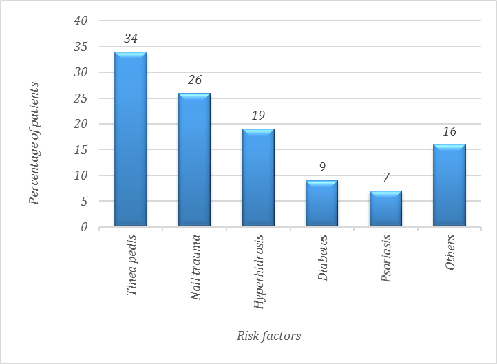 The most common risk factors were tinea pedis in 34 patients (30.6%), nail trauma in 26 (23.5%), hyperhidrosis in 19 (17.1 %), diabetes 9(8.1%) and psoriasis 7(6.3%).