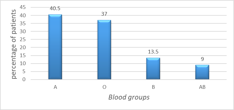 Among the blood types, type A was observed in 45 patients (40.5%), type O in 41(37 %), type B in 15 (13.5%) and type AB which was the least common in 10 (9%) (Figure 3).