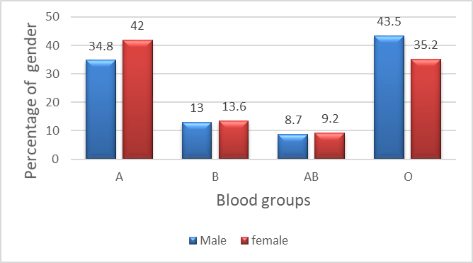 Also, Chi-square analysis showed no statistically significant association between risk factors and blood groups in males (Chi-square = 7.82, df = 15, p = 0.931). All p-values were greater than 0.05, indicating that there were no statistically significant differences in the distribution of risk factors among the different blood groups (Table 3).